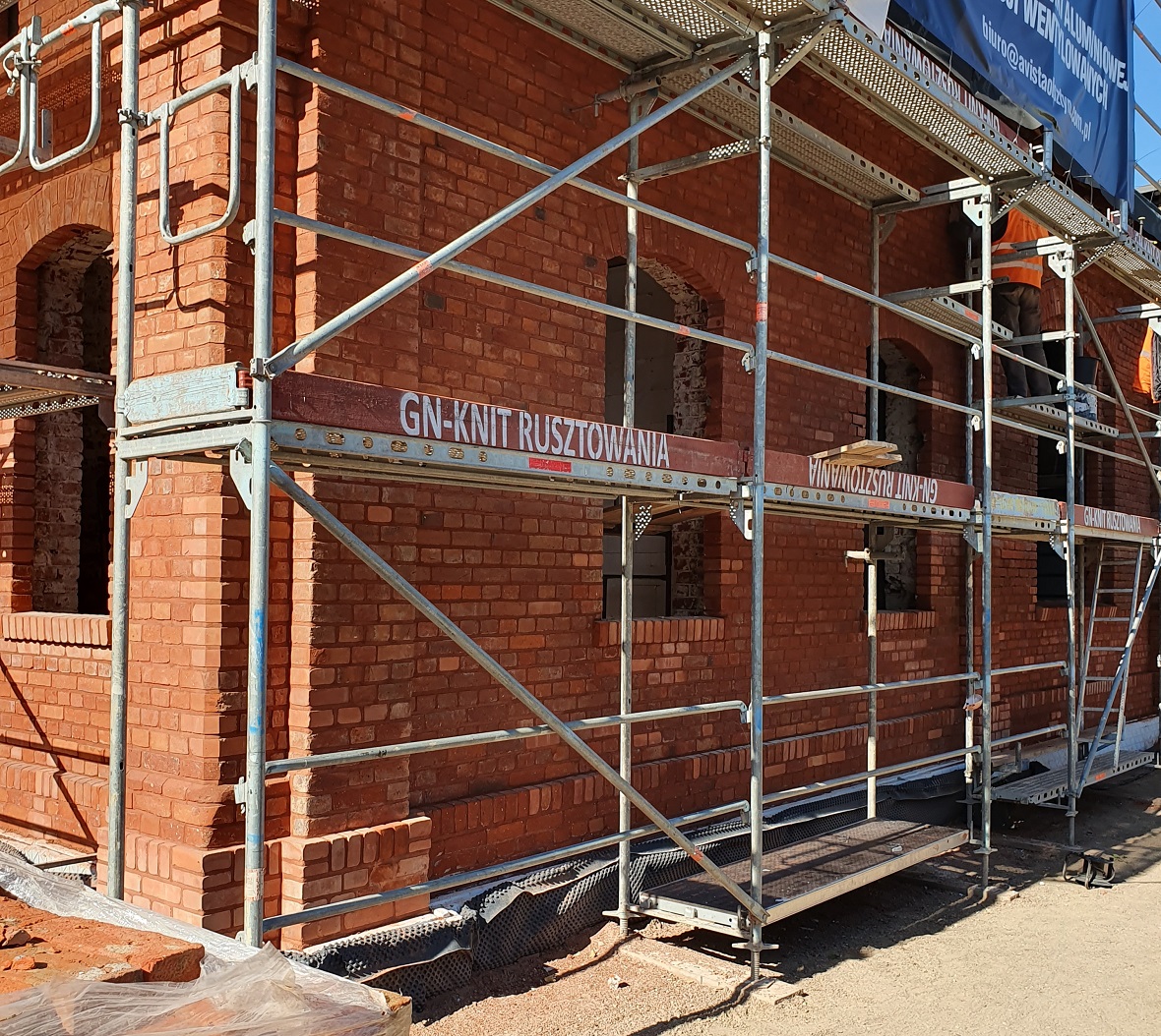 Trwają prace renowacyjne ceglanych ścian zewnętrznych zabytkowego kompleksu dawnej rzeźni miejskiej w Olsztynie. Na jednym ze zdjęć widać fragment zrekonstruowanej fugi w formie półwałka. Prace wykonane przez pracowników GN-KNIT w ramach realizacji projektu Apartamenty Dragonów.