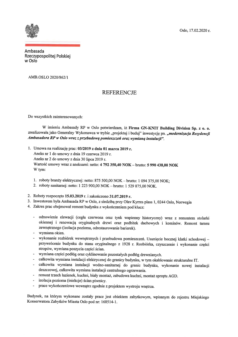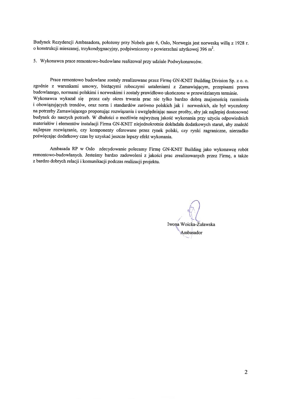 W dziale “REFERENCJE” zamieściliśmy otrzymane od Pani Ambasador Ambasady RP w Oslo rekomendacje na wykonane przez nas prace w ramach zadania ” remont i rozbudowa rezydencji Ambasadora RP w Norwegii”