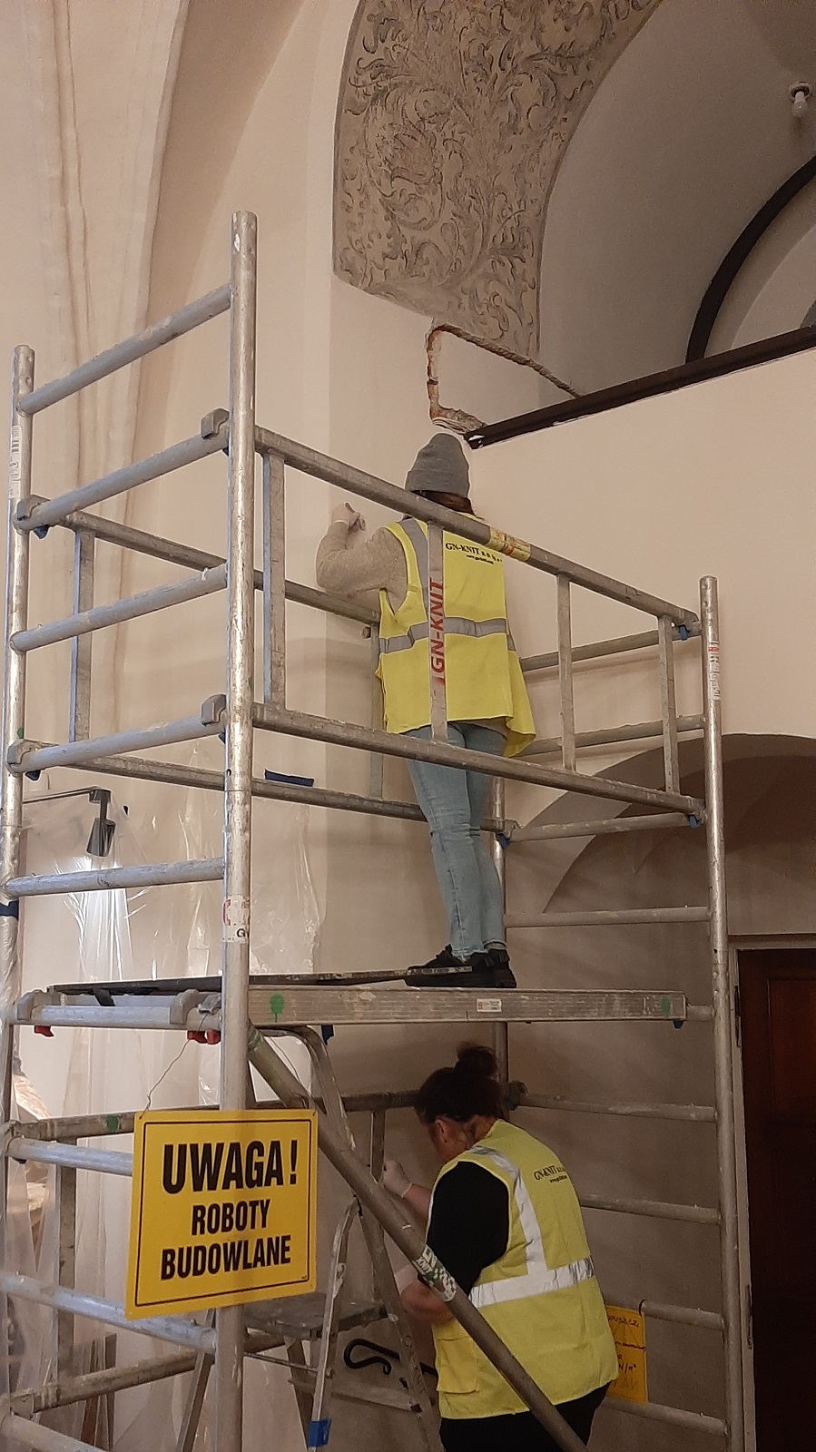 Przed ułożeniem tras kablowych musimy sprawdzić czy pod farbą i tynkiem nie znajdują się cenne malowidła. Prace te wykonują Panie konserwatorki z firmy Akroterion.